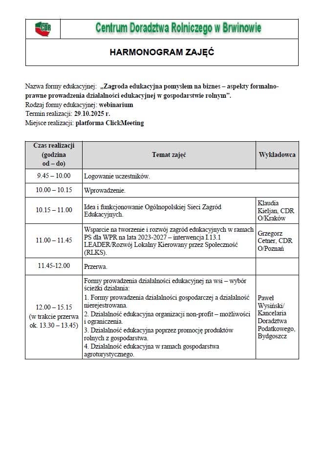 Centrum Doradztwa Rolniczego w Brwinowie Oddział w Krakowie zaprasza na bezpłatne webinarium pt: „Zagroda Edukacyjna pomysłem na biznes – aspekty formalno-prawne prowadzenia działalności edukacyjnej w gospodarstwie rolnym” które odbędzie się 29 października 2025 r. (środa) w godz. 10:00-15:45.