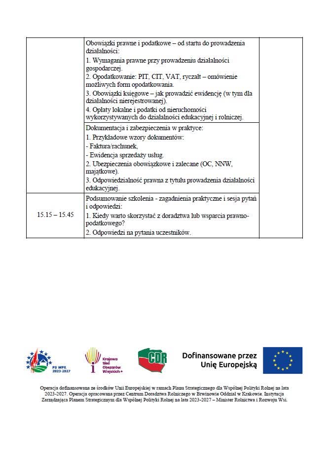 Szkolenie realizowane jest w ramach operacji własnej pn. „Zwiększenie udziału rolników w Ogólnopolskiej Sieci Zagród Edukacyjnych”, finansowanej ze środków Schematu II Pomocy Technicznej Planu Strategicznego WPR 2023–2027.